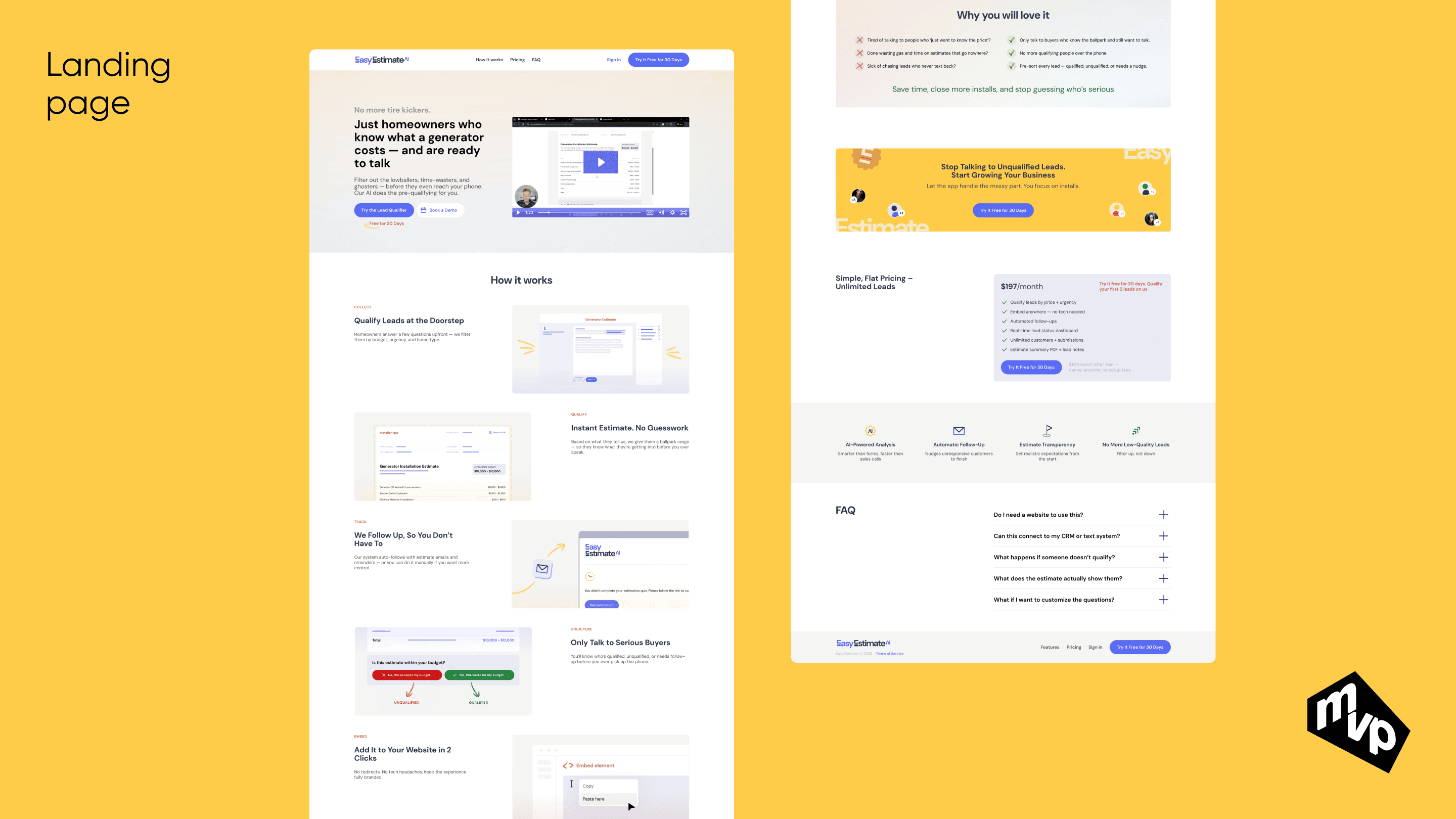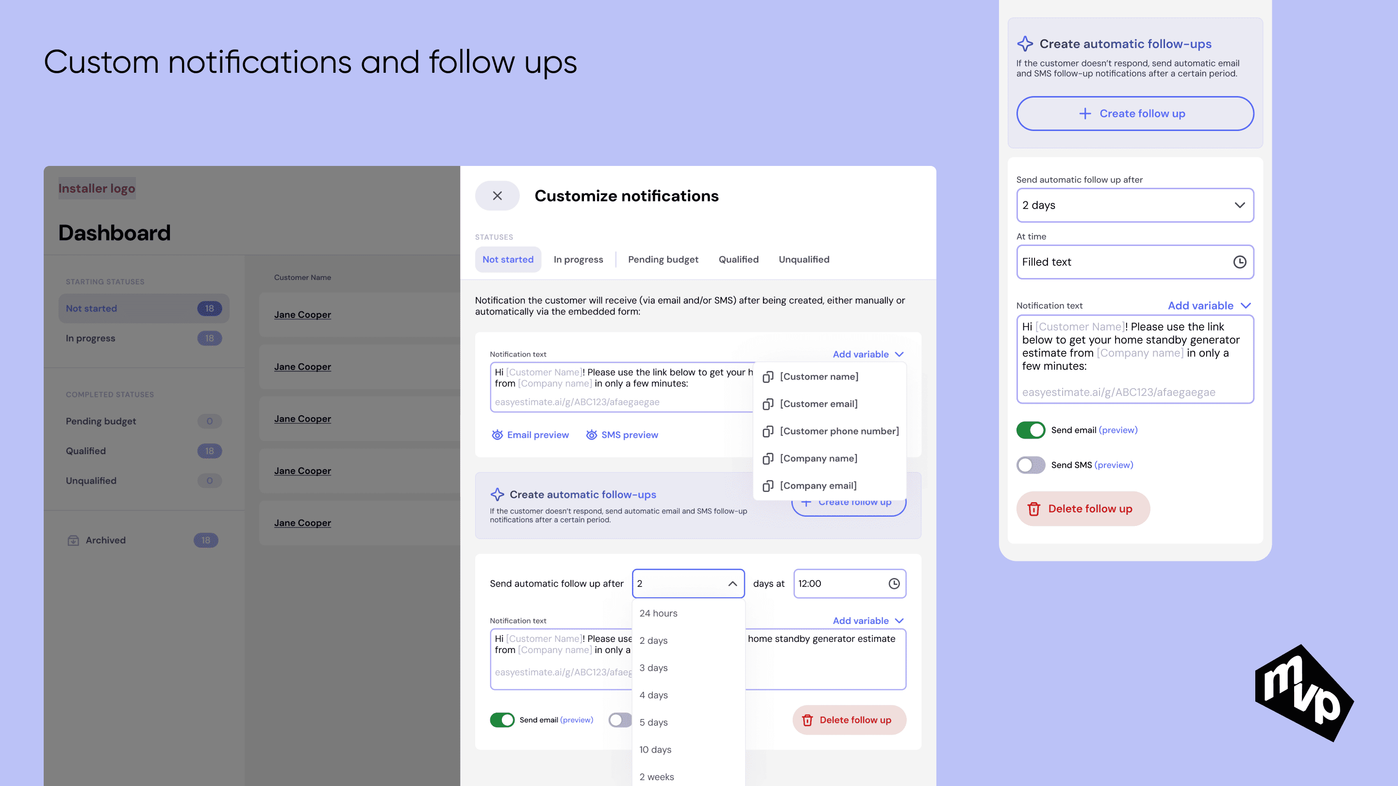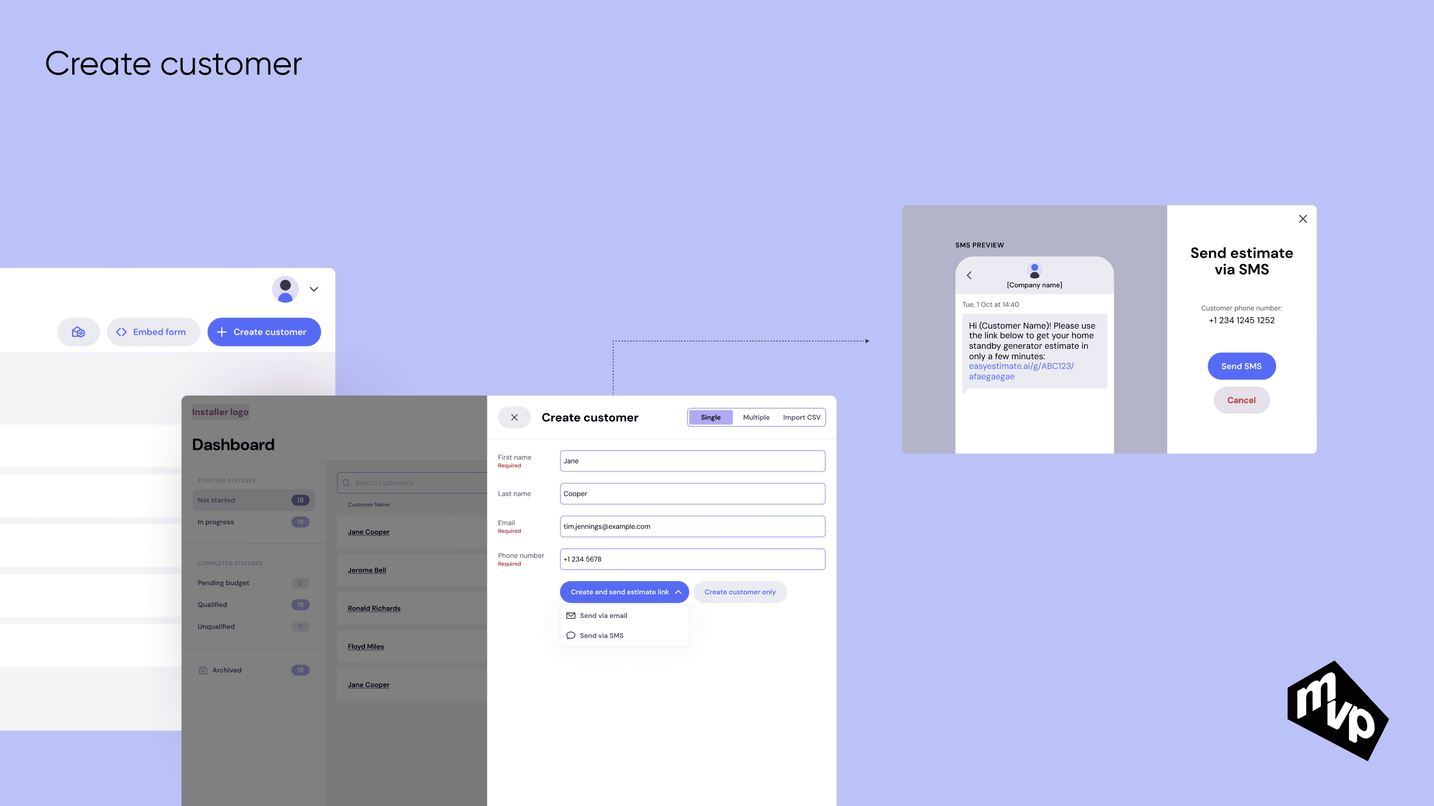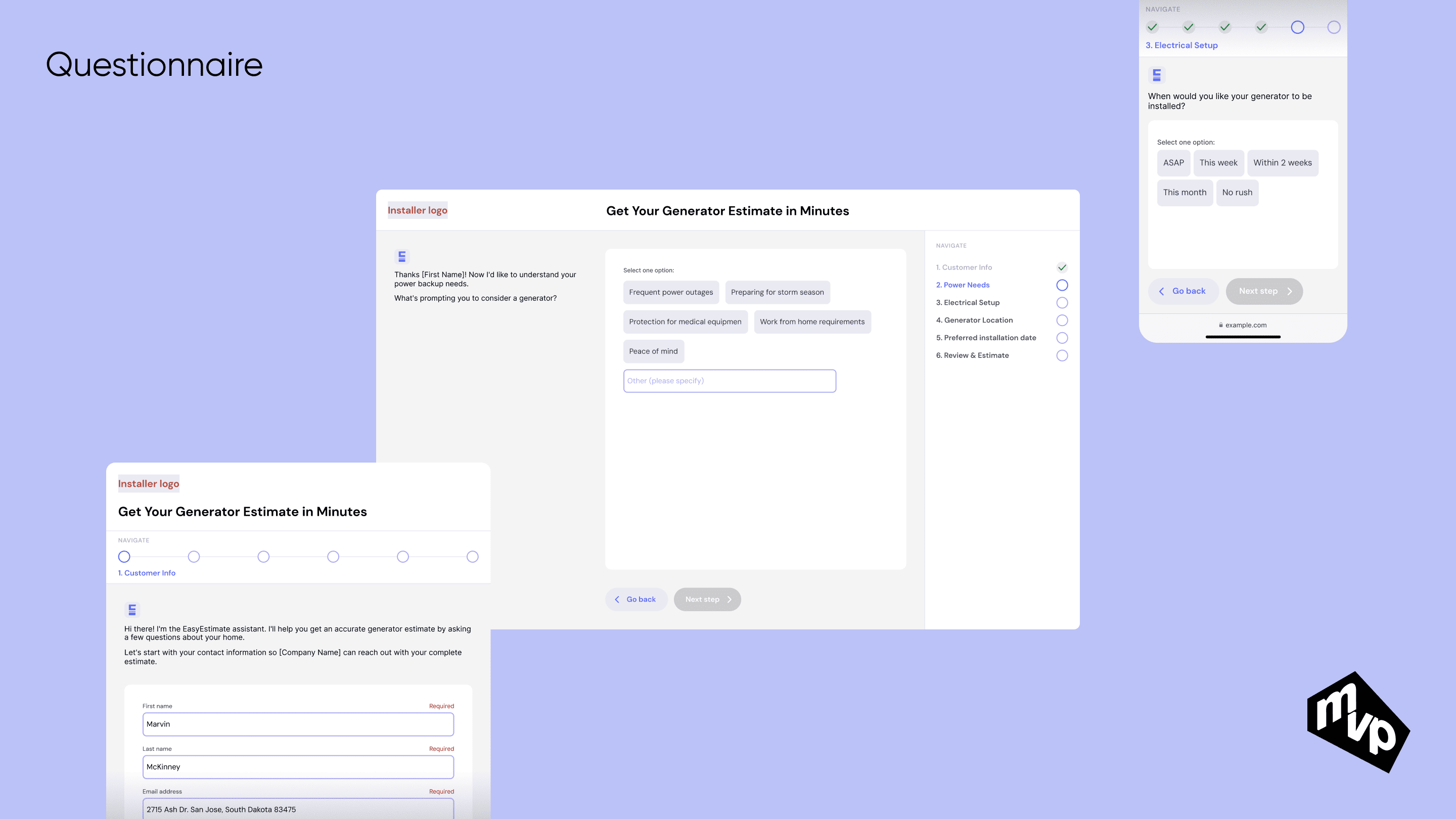 A platform designed for generator installation companies to qualify and manage potential customers efficiently. Installers can create and organize customer profiles, send qualification questionnaires, and automatically get generated AI-powered estimates based on customer responses. The system streamlines lead qualification, saving time and ensuring accurate, data-driven proposals.